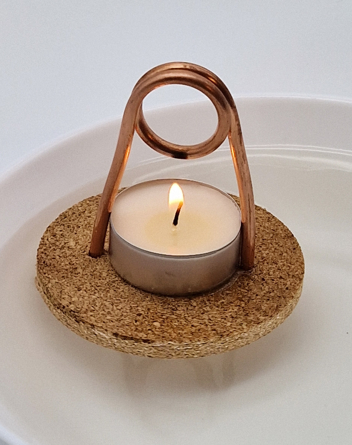 Floating element in cork, copper pipe, tools, candle and instructions in Norwegian.